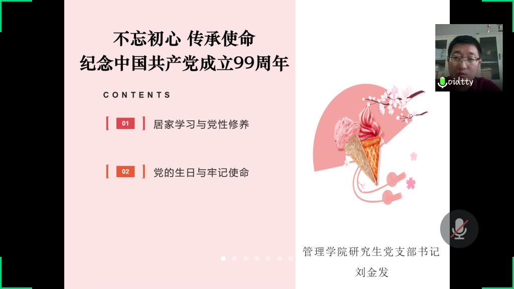 2020年6月23日17时,澳博娱乐 研究生党支部在线上开展"支部书记讲党课"活动。本次党课主题为“不忘初心,传承使命——庆祝中国共产党成立99周年”。澳博娱乐 研究生党支部书记刘金发同志担任主讲人。