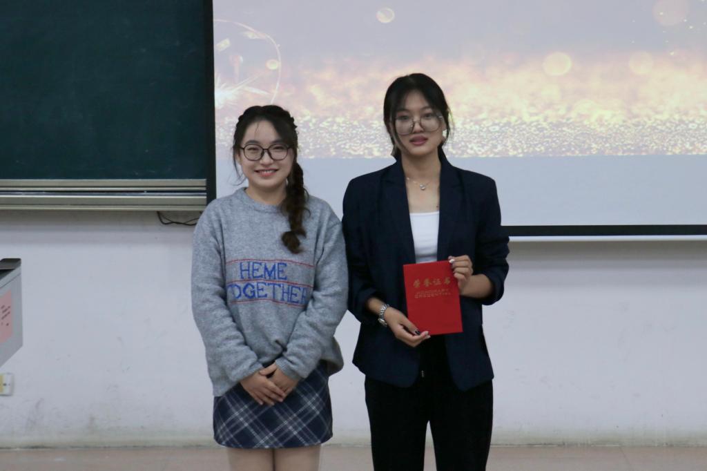 图为学生会主席为一等奖同学颁奖