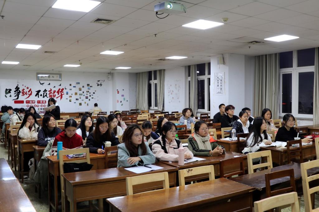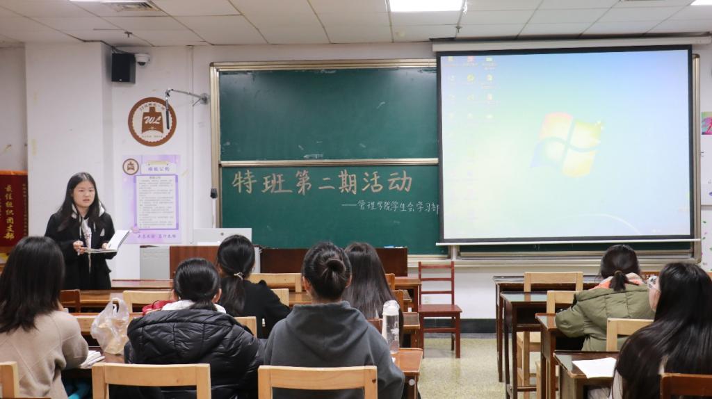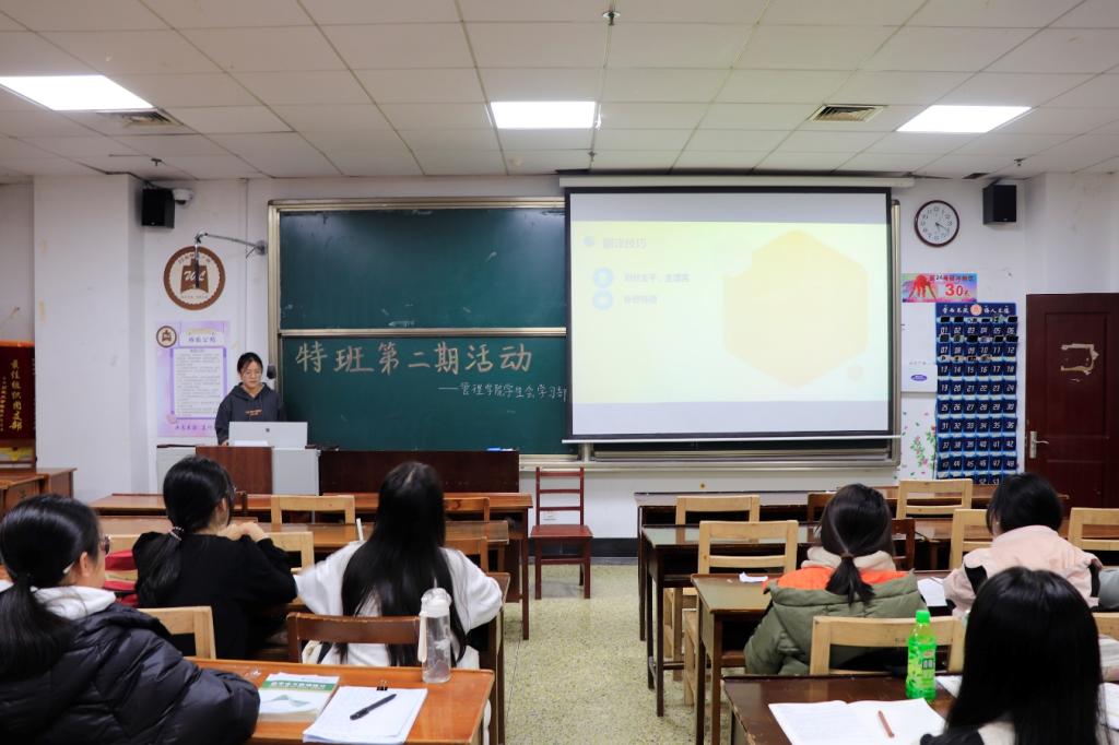课上,谢怡宁分享了自己的学习经验,她结合自身情况从学习目标、学习方式、劳逸结合、保持好心态分四部分讲述了自己的学习方式;紧接着,杨佳琦从专业课学习、英语学习、数学学习、综测四个方面展开阐述,她通过树状图分享自己的学习过程,内容丰富、逻辑清晰,让特班成员能够学习借鉴,取长补短,进而完善自己的学习方式;随后,许天雅分享四级通关技巧,她从听力、阅读、翻译三个方面入手,用通俗易懂、简洁明了的语言分享了自己的经验;最后,孙禧越结合自身经历讲述了明确目标和端正态度的重要性,并提倡同学们要注重学习的方法。