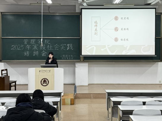 本次培训会上,主讲人对社会实践的流程以及实践报告的撰写进行讲解,详细介绍了实践项目选择、实践计划制定、实践总结等内容;随后,对稿件撰写和照片拍摄方法进行培训,针对稿件撰写中易出现的问题和照片拍摄的注意事项进行了重点说明。此次培训会还特别邀请了2024年暑期社会实践先进个人孟倩菲作经验分享,她结合自身经验分享社会实践方法和心得,激励同学们积极投身于社会实践,用脚步丈量祖国大地、用内心感应时代脉搏。