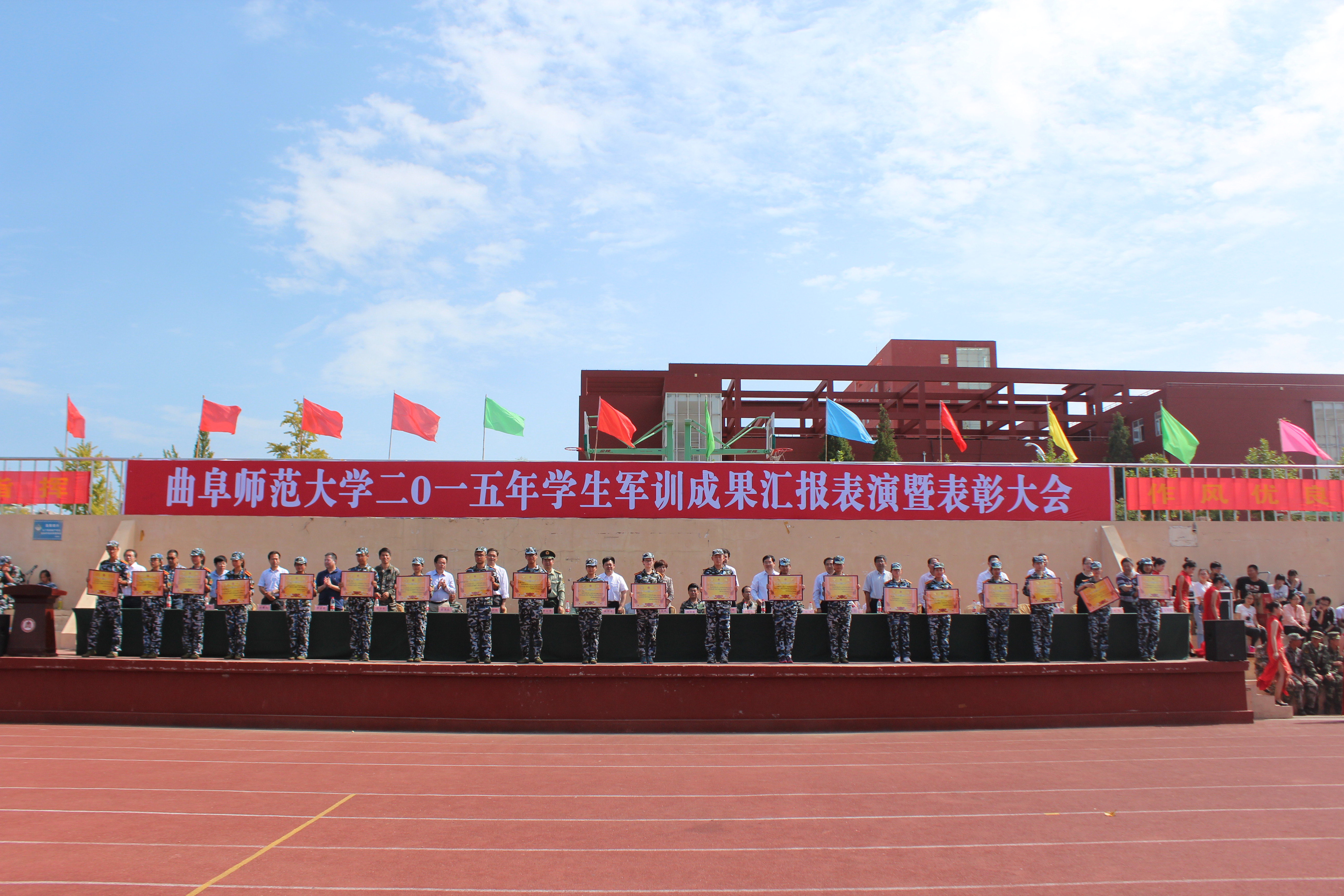 日照校区2015年学生军训成果汇报表演暨表彰大会于校区西操场隆重举行。澳博娱乐