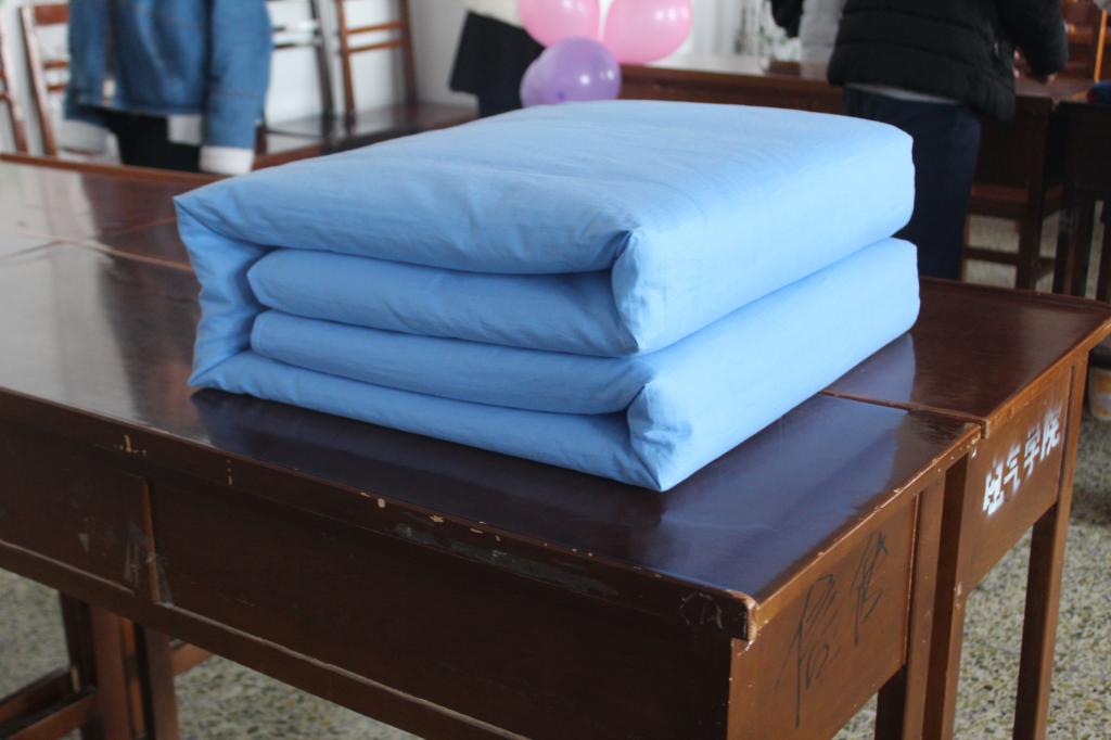 由主持人简单介绍规则后,参赛同学根据抽签顺序依次上前大展身手。同学们信心满满,伴着悠扬的音乐,被子在他们手中折的游刃有余,一床普普通通的被子不一会儿就变成整整齐齐的“豆腐块”,而后耐心细致的他们勾角、拉边,一个个方块被赢得了观众的阵阵掌声,段希倩的一首《在树上唱歌》缓解了现场比赛同学的紧张,调动了现场气氛。最后,2015级的十佳叠被子能手的娴熟展示为比赛拉上帷幕。