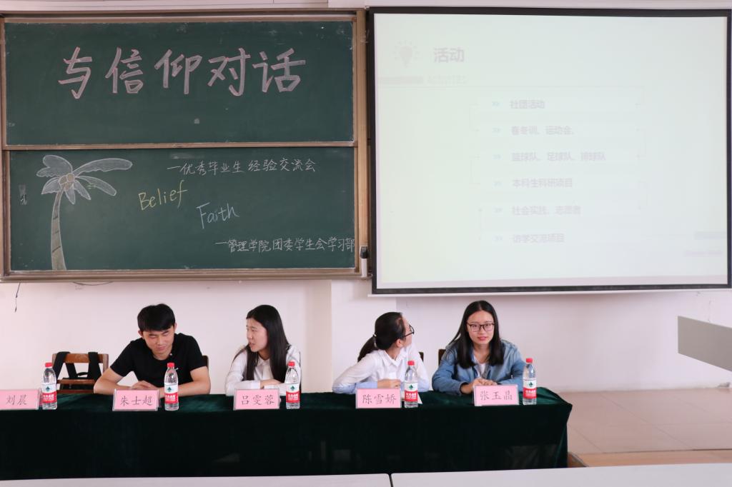 浏览量: 更新日期:2018-05-28为贯彻落实“五个一”工程,加强澳博娱乐 党团建设,创新学生“学习+”成长成才模式,帮助同学们明确未来方向,掌握学习技巧,5月27日9:00,澳博娱乐 于JA301召开了“与信仰对话——优秀毕业生经验交流会”,会上邀请了澳博娱乐 优秀学子吕文蓉、陈雪娇、刘晨、朱士超及张玉晶与大家分享他们的经验。