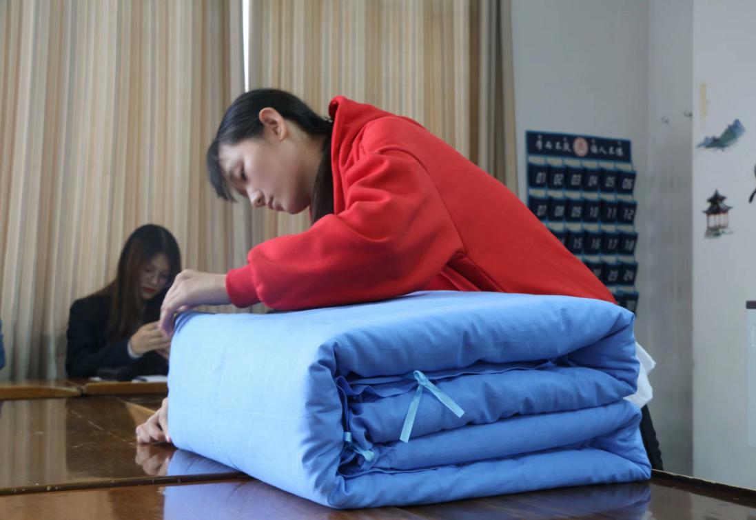 比赛前期同学们踊跃报名,并充分利用课余时间进行练习。活动伊始,主持人介绍比赛规则,本次活动共将参赛选手分为十组,每组三到四人不等,通过评委打分,评选出“最佳叠被能手”。各参赛连贯有序的动作与整齐方正的被子得到了观众的一致好评。最后,共有11位同学荣获“十佳叠被能手”称号。