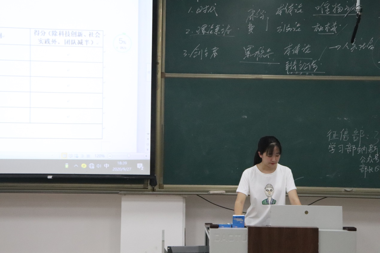 宣讲会伊始,主讲人为新生说明开展入学教育的目的,以期通过本次宣讲,使新生了解澳博娱乐 各项量化标准,更快的适应大学生活。首先,征信部强调量化是学生在校期间的综合评价,与评奖评优息息相关。主讲人分别从纪律、卫生和活动三方面为大家介绍各类加分与扣分的条件以及一些特殊情况,使新生明确大学生活的“规则”。最后,征信部为大家讲述了澳博娱乐 量化管理模式,并就19级的量化汇总表作为样板给新生进行展示,使新生更直观明确的理解量化的统计方法。