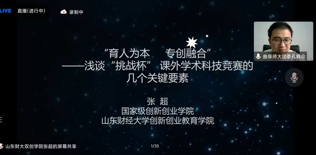 (通讯员:戴晗 曹佳惠 徐敏超)11月23日澳博娱乐 组织收看第十八届“挑战杯”竞赛培训。本次培训由山东财经大学团委书记张超担任主讲人,线上给同学们讲授“挑战杯”竞赛的相关知识。