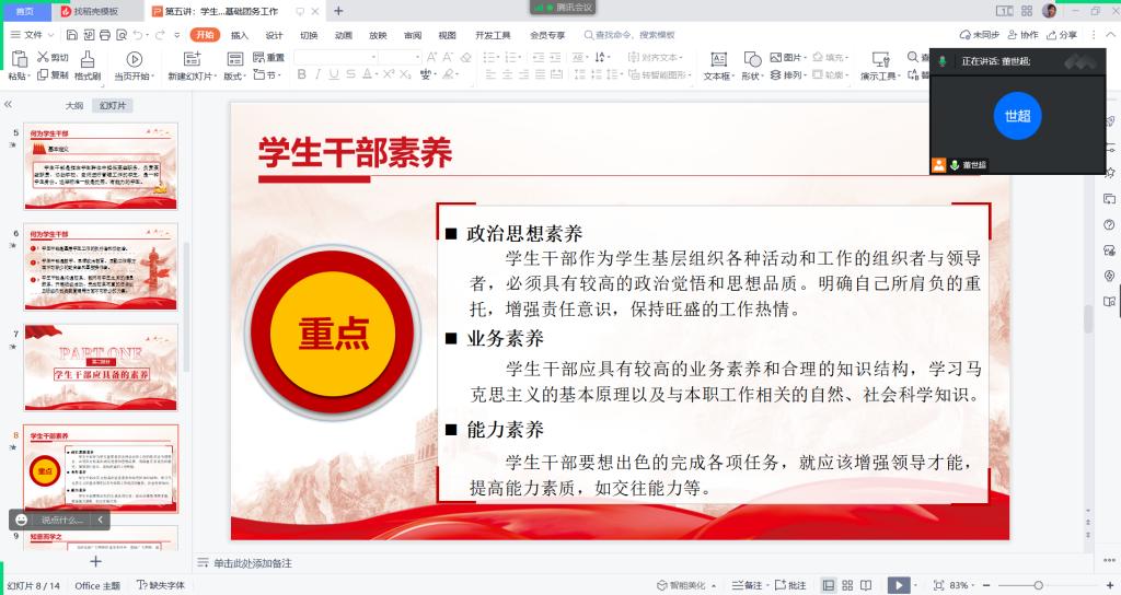 会议伊始,董世超从学生干部的定义和学生干部应尽的职责两个方面展开讲解,详细地阐述了何为学生干部。随后,董世超表示学生干部应该具有政治思想素养、业务素养及能力素养,并从“知意而学之”、”学之而有利“等方面鼓励学生干部在努力提高自身素质的同时,用实际行动诠释初心使命,践行责任担当。最后,董世超将目前学生干部队伍中存在的问题进行总结,告诫学生干部要及时纠正自身错误,加强自身修养。与会成员纷纷表示会做好本职工作,完成组织交给的各项任务,承诺将会以全新的状态投入到日后的工作之中。
