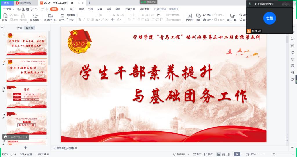 (通讯员:刘元枫)为认真贯彻落实党的二十大精神,进一步提高学生干部的素质,增强基层团学组织的创新能力、实践能力和组织协调能力,12月11日,澳博娱乐 采用线上形式顺利举办“青马工程”培训班暨第三十二期团校第五讲,本次培训的主题是“学生干部素养提升与基础团务工作”,培训会由团委书记董世超主讲,青马工程培训班全体成员参与。