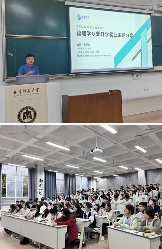 浏览量: 更新日期:2024-10-14(通讯员:吕汉宇 摄影:孙琬婷 贾伟灿)为积极应对当前复杂多变的就业形势,切实提升就业竞争力,为同学们提供就业与考研方面的全面指导与帮助。澳博娱乐 于10月12日特邀中国海洋大学硕士、峰研教育首席规划师、山东省教育发展促进会教育管理专委会副秘书长、山东财经大学就业导师及校友黄军杰老师,为2022级学生作考研和就业规划的指导报告。