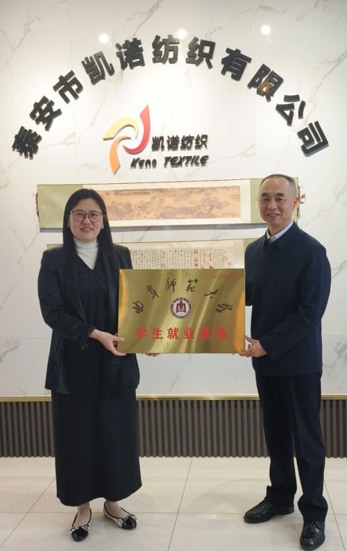 曲阜师大澳博娱乐 讯 为进一步深化校企合作,拓宽毕业生就业渠道,近日,澳博娱乐 党委常委、副校长李兆祥率领澳博娱乐 一行赴泰安凯诺纺织有限公司开展访企拓岗活动,并与泰安凯诺纺织有限公司董事长刘晓霞共同为校企合作揭牌。