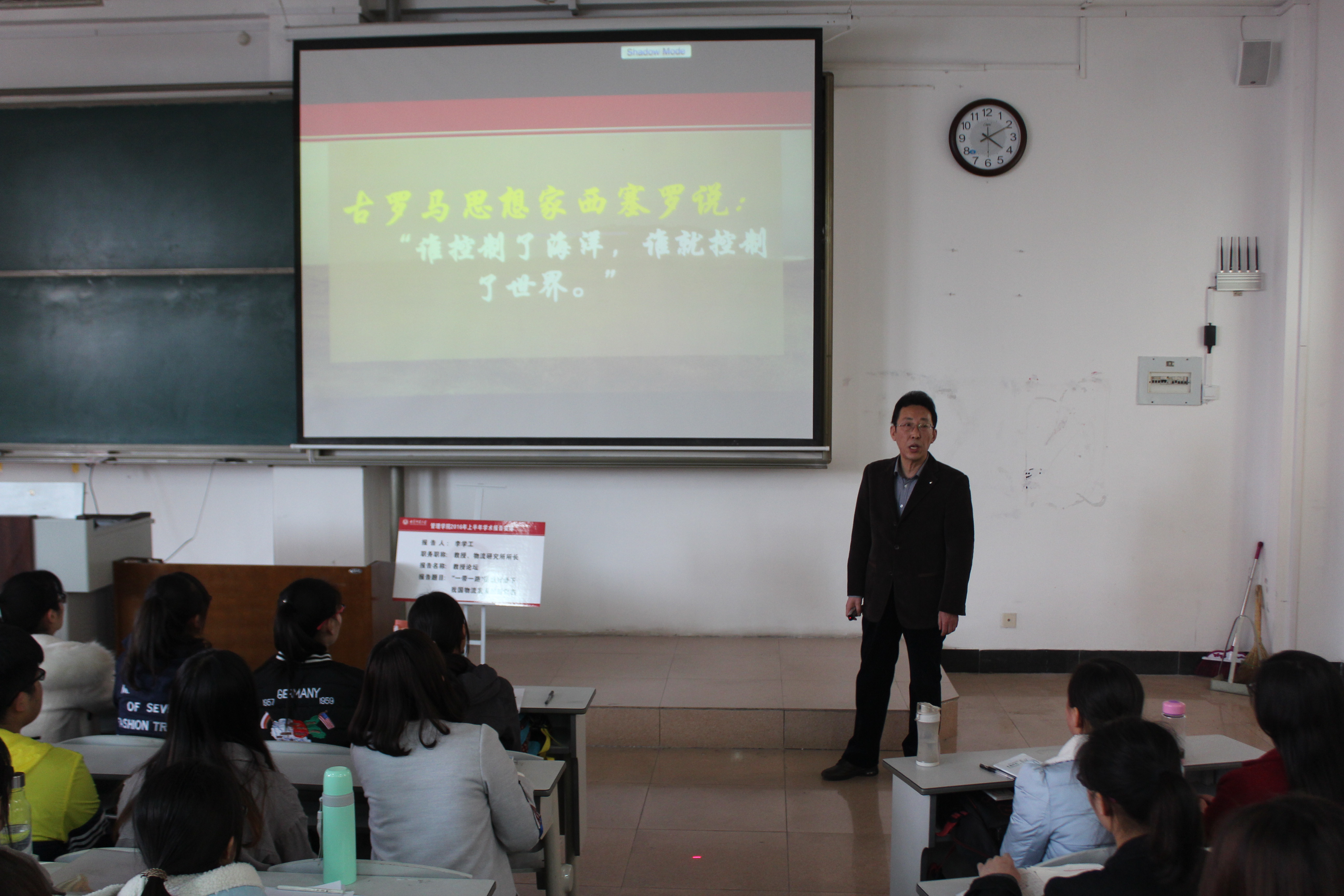 报告开始之前,赵杰书记简单介绍了李学工教授的教学研究成就以及获得的荣誉,并强调了“一带一路”倡议对当代中国的重要性。随后,《“一带一路”倡议下中国物流全球化发展的新常态》报告正式开始。报告伊始,李学工教授引用了古罗马思想家西塞罗的“谁控制了海洋,谁就控制了世界”的名言,形象说明海洋对于中国的重要性。紧接着,李学工教授从“一带一路”倡议的具体含义、“一带一路”倡议的国家战略、金砖开发银行中中国所占话语权、丝路基金、“一带一路”倡议的未来彰显效果、中国全球战略下的合作框架体系以及中国的物流战略选择等方面展开具体的讨论,并运用详细的实例对各方面进行了介绍。最后,李教授又详细认真的回答了部分同学提出的疑问,并号召同学们一起期待描绘“一带一路”中国的物流版图。整个教室座无虚席,此次报告在同学们的掌声中圆满结束。