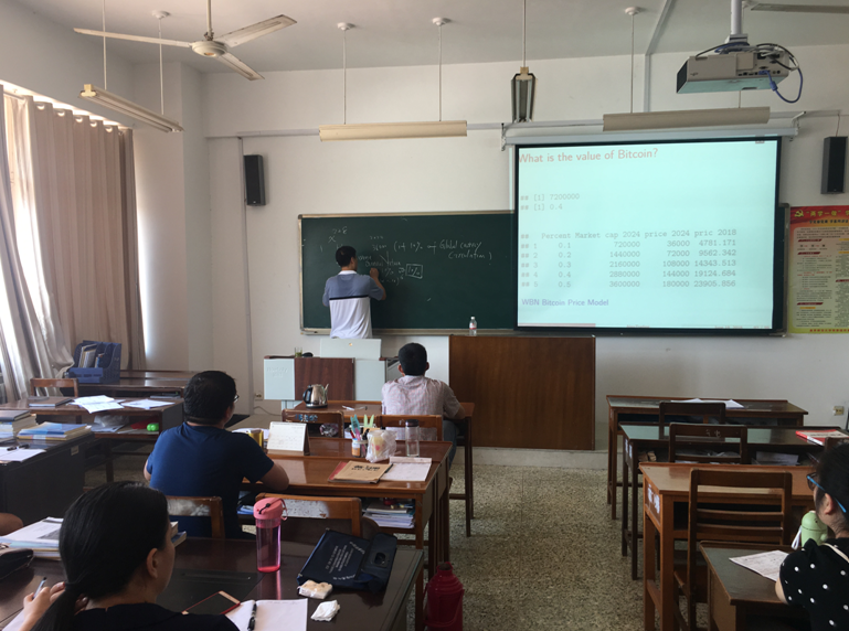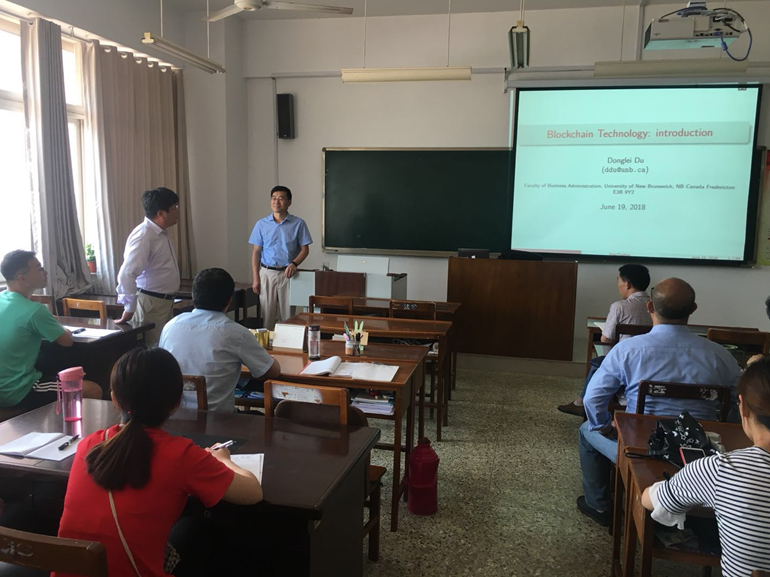 浏览量: 更新日期:2018-06-236月20日—6月22日,加拿大新布朗什维克工商澳博娱乐 副院长杜东雷教授应运筹学研究院邀请来澳博娱乐 ,做了题为“BlockChain Technology”的系列专题讲座,本专题讲座以比特币为主要事例,介绍区块链技术的基本概念,机制及应用。讲座由澳博娱乐 运筹学研究院院长张玉忠教授主持。