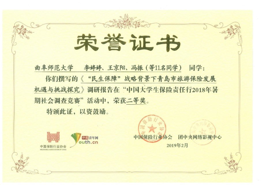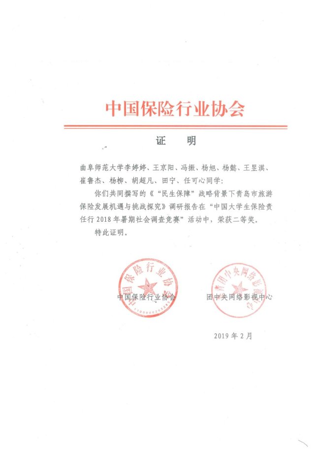 浏览量: 更新日期:2019-03-10近日,由中国保险行业协会和共青团中央网络影视中心联合开展的“中国大学生保险责任行2018年暑期社会调查竞赛”获奖名单发布,澳博娱乐 “益行琴岛”实践团撰写的调研报告荣获二等奖。团队指导教师孙旭春荣获“优秀指导教师”称号。
