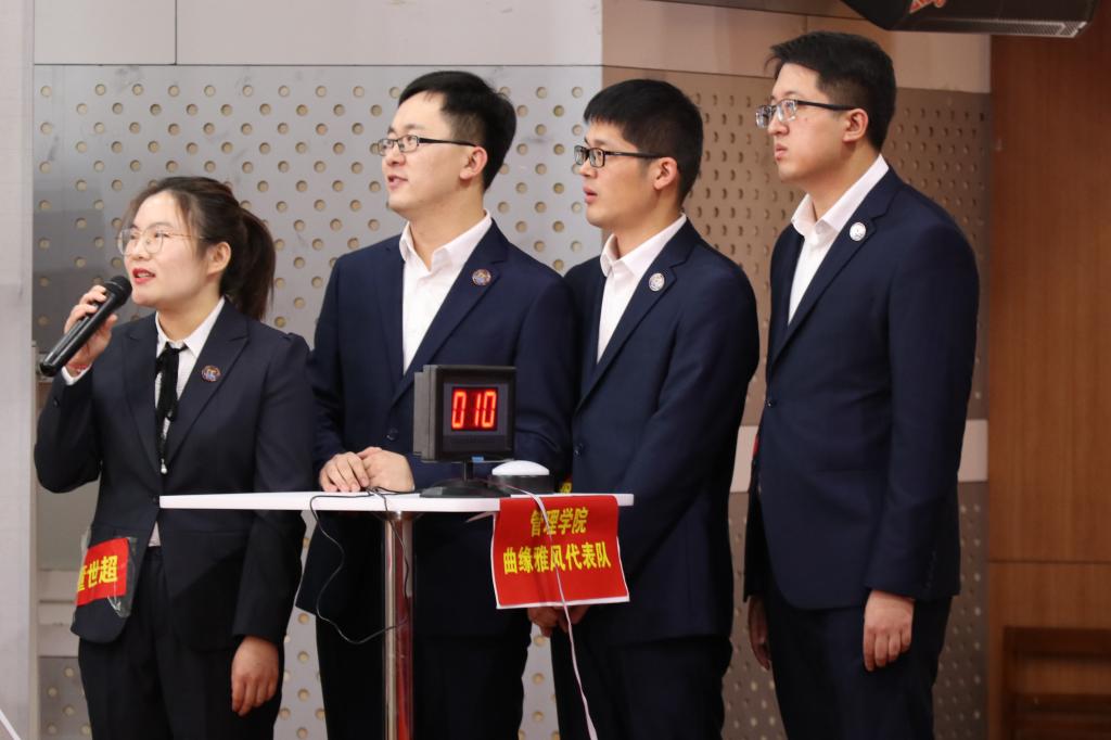 职业礼仪风采大赛分为“形象展示”、“知识竞赛”、“粉笔板书”、“即兴演讲”及“情景模拟”五个环节。大赛伊始,澳博娱乐 代表队集体整装亮相进行形象展示,通过古代教师礼仪与现代礼仪操相结合的方式展示了管院“四雅”教师的礼仪风范。在知识竞赛与粉笔板书环节中,澳博娱乐 代表队沉着冷静、细心思考。接下来的两个环节作为比赛的高潮更加精彩纷呈,代表队伍对临时抽取的题目进行即兴演讲与情景模拟,他们镇定自若,认真思考,最终以自然大方的仪态,优雅自如的神情,有条不紊的言谈,为观众呈现了一场视听盛宴,并为此次大赛画上了一个圆满的句号。最终,澳博娱乐 代表队荣获三等奖第一名。