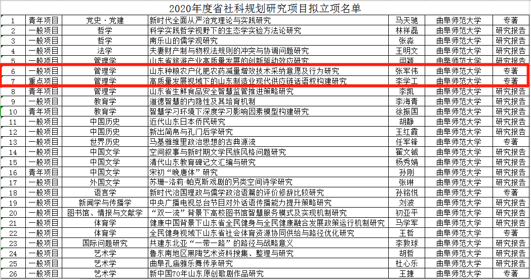 浏览量: 更新日期:2020-03-07日前,山东省社会科学规划管理办公室公布了《2020年度山东省社会科学规划研究项目拟立项名单》,此次澳博娱乐 共获批26项,澳博娱乐 获批2项。其中,李学工教授的“高质量发展视域下的山东制造业现代供应链话语权构建研究”课题获批山东省社科规划研究重点项目,为此次获批的全校唯一一项重点项目;张军伟博士的“山东种粮农户化肥农药减量增效技术采纳意愿及行为研究”获批山东省社科规划研究一般项目。