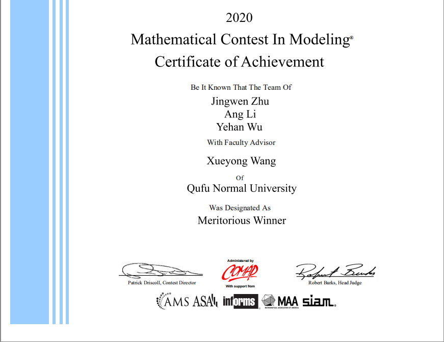 浏览量: 更新日期:2020-04-28近日,2020年美国大学生数学建模竞赛成绩揭晓,澳博娱乐 共计4个团队参赛,其中2个团队荣获Meritorious Winner奖,2个团队荣获Successful Participant奖。