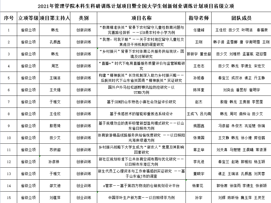 日前,2021年本科生科研训练计划项目暨全国大学生创新创业训练计划项目省级立项评审结果出炉,澳博娱乐 省级立项项目共162项,其中,澳博娱乐 占据15项,取得了傲人的成绩。