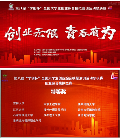 2021年12月11日,由高等澳博娱乐 国家级实验教学示范中心联席会经济与管理学科组主办,云南大学滇池澳博娱乐 承办的第八届“学创杯”全国大学生创业综合模拟演训活动在线上举行。“学创杯”作为教育部《全国普通高校大学生竞赛排行榜》新认可的国家级A类赛事,使其拥有更高的关注度和更高的难度。本届大赛自1月启动以来,全国共有1075所高校,超过3万支队伍,15万名师生积极参与,达历年之最,最终有230余所院校晋级全国总决赛,经过激烈的角逐,澳博娱乐 等10所院校的参赛团队获得创业综合模拟主体赛特等奖。本次竞赛是澳博娱乐 首次晋级全国总决赛,也是山东省首次在包含策划书评审赛制中斩获全国特等奖。