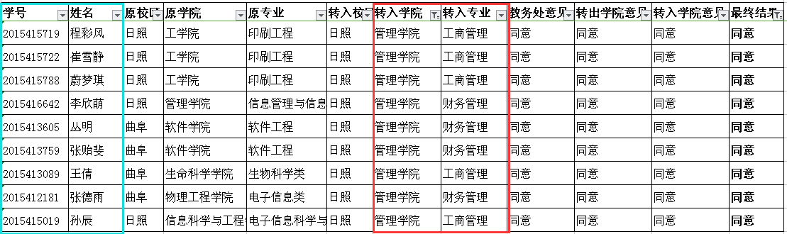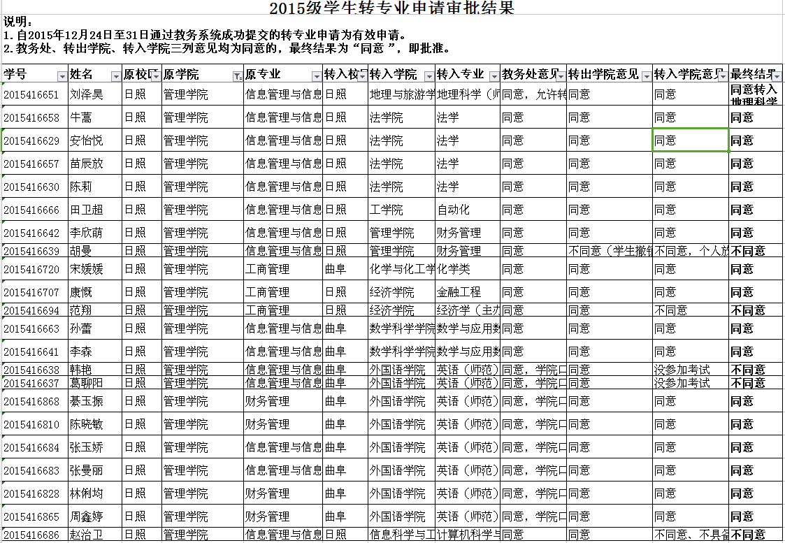 各澳博娱乐 、各有关部门: 根据《关于受理2015级学生转专业申请的通知》(教务处2015.12.24)要求,经学生申请、教务处和澳博娱乐 审批,现批准455名学生调整专业,名单见附件。 其他有关事项通知如下: 一、已批准学生的教务系统学籍数据已调整,学生可登陆教务系统查到,如发现专业信息或培养方案与本通知附件不符,请向教务行政科反映。 二、学生自下学期开学时转入新专业学习,本学期在原专业完成期末考试后所获学分仍然有效。及格课程中,与新培养方案课程号一致的,将直接获得新培养方案要求的学分;与新培养方案课程号不同,但实际课程内容相同的(例如生物和化学的高等数学),可于下学期开学后,向新培养方案课程的开课单位申请课程代换;其他无关课程,课程属性转换为任选课。 三、澳博娱乐 各关部门请在下学期开学前(2月27、28日报到,29日上课),安排好学生的宿舍调整、学费计算、校区账户切换等工作。 教务处 2016年1月13日 1.转出名单(17人)