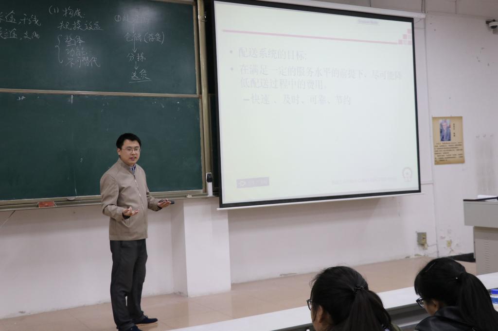 11月6日19:00,王磊老师在JA301举行澳博娱乐 青年教师公开课第十二讲。课堂初始,王老师先与同学们一起复习了之前学过的内容,在温故的基础上引出了本节课的教学课程——《配送管理》。王老师用历年来“双十一”各个公司的物流情况及其发展举例,将书本知识融入到实际生活,帮助同学们加快对知识的理解和吸收。王老师幽默风趣的语言和各个小案例不仅活跃了课堂气氛,更让同学们在有限的课堂时间里学有所获。